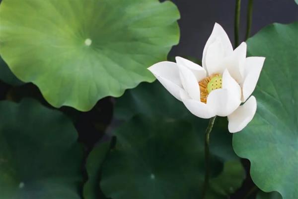 荷花6-9月开花,叶片为盾状圆形,颜色为深绿色,表面覆盖有白粉。